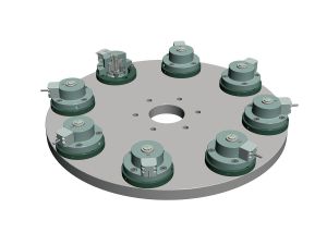 Wir fertigen Mehrfachspanneinrichtungen mit mechanisch, hydraulisch betätigten Spanngeräten, die auf einem Rundtisch angeordnet sind. Bei der abgebildeten Spannvorrichtung sind acht Spanngeräte auf einer runden Grundplatte angeordnet, Anschlussleitungen für Pneumatik oder Hydraulik sind nicht erforderlich. Die einzelnen Spanngeräte sind mit einer Tellerfederspannung ausgestattet. Die Tellerfederpakete drücken die Druckhülse nach vorne, somit wird die axial feststehende Zugspannzange geschlossen. Die Spannzange ist mit einem Stift gegen das Verdrehen gesichert. Entspannt wird die Spannzange durch einen mechanisch betätigten Kolben. Im Kolbenraum befindet sich Öl, das bei Betätigung des mechanischen Kolbens die Druckhülse nach hinten bewegt. Somit ist das Spanngerät selbsthaltend, ein Hydraulikanschluss ist nicht erforderlich.