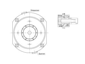 Bei den Standardgeräten ist die Druckhülse als doppelt wirkender Zylinder ausgeführt und schließt bzw. öffnet die Spannzangen. Die Spannzangen selbst sind am Schaft mit einer Planschulter versehen und mittels einer Mutter fest mit dem Einbauspanner verbunden. Diese Spanngeräte eignen sich auch hervorragend zum Innenspannen von Werkstücken. Dazu wird statt der eingebauten Spannzange ein axial feststehender Grunddorn mit der Außenkontur einer Spannzange eingebaut und mit einer Überwurfmutter in das Gehäuse eingeschraubt. Zum Spannen des Werkstückes wird, je nach Anwendungsfall, eine einfach- oder doppelkegelige Spannhülse verwendet. Diese wird beim Spannen mittels Zugdorn auf den Grunddorn gezogen und aufgeweitet. Hierbei entsteht ein Niederzugeffekt, das Werkstück wird beim Spannen in Richtung des Gehäuses gezogen; gerne legen wir diese Futter für einen Werkstückanschlag aus. Selbstverständlich werden diese Geräte, falls erforderlich, speziell für Ihre Anwendungen anders ausgelegt.
