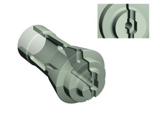Purely special design on customer demand: Whatever type of collet is involved, Nann supplies collets with special slots. Slanted slots are very often used when workpieces with profiled bored bores need to be clamped. The slanted slots on the collet prevent the edges of the clamped profiled bore from getting stuck in the slots of the collet, ensuring that the workpiece is securely clamped. In certain application scenarios a work-piece with toothed wheelwork can also be clamped using a slanted-slot collet. Here, too, the slanted slot prevents the toothed wheelwork from getting stuck in the collet slots. Alongside collets with slanted slots Nann also produces collets with slot numbers that differ from the standard collet, or collets with asymmetrical slots.