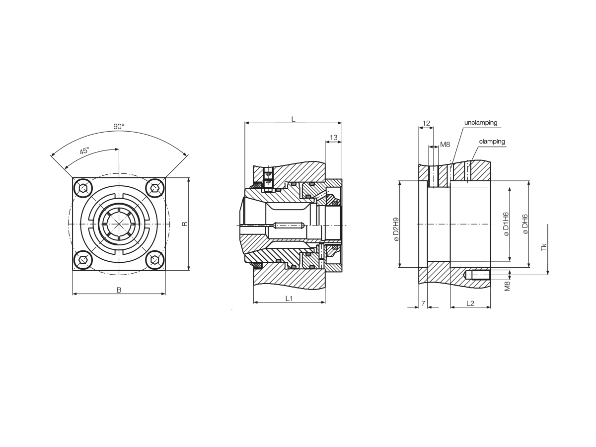 art. no. | D | D1 | D2 | L | L1 | L2 | B | Tk | collet type |