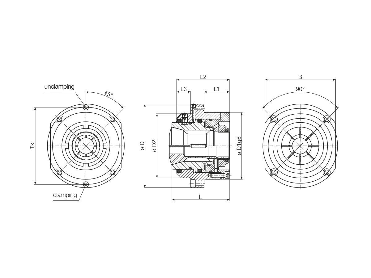 These clamping units correspond to the Type HESK units but without a housing. They are especially used for installation on rotaryindexing tables.