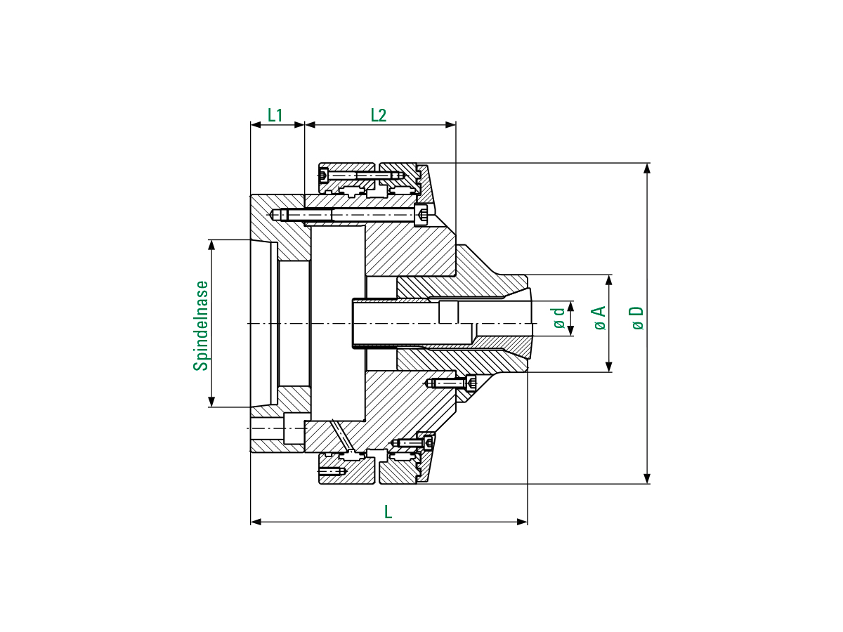 | Art.-Nr. | Spindelnase | D | A | L | L1 | L2 | Spannbereich | Spannzangen |