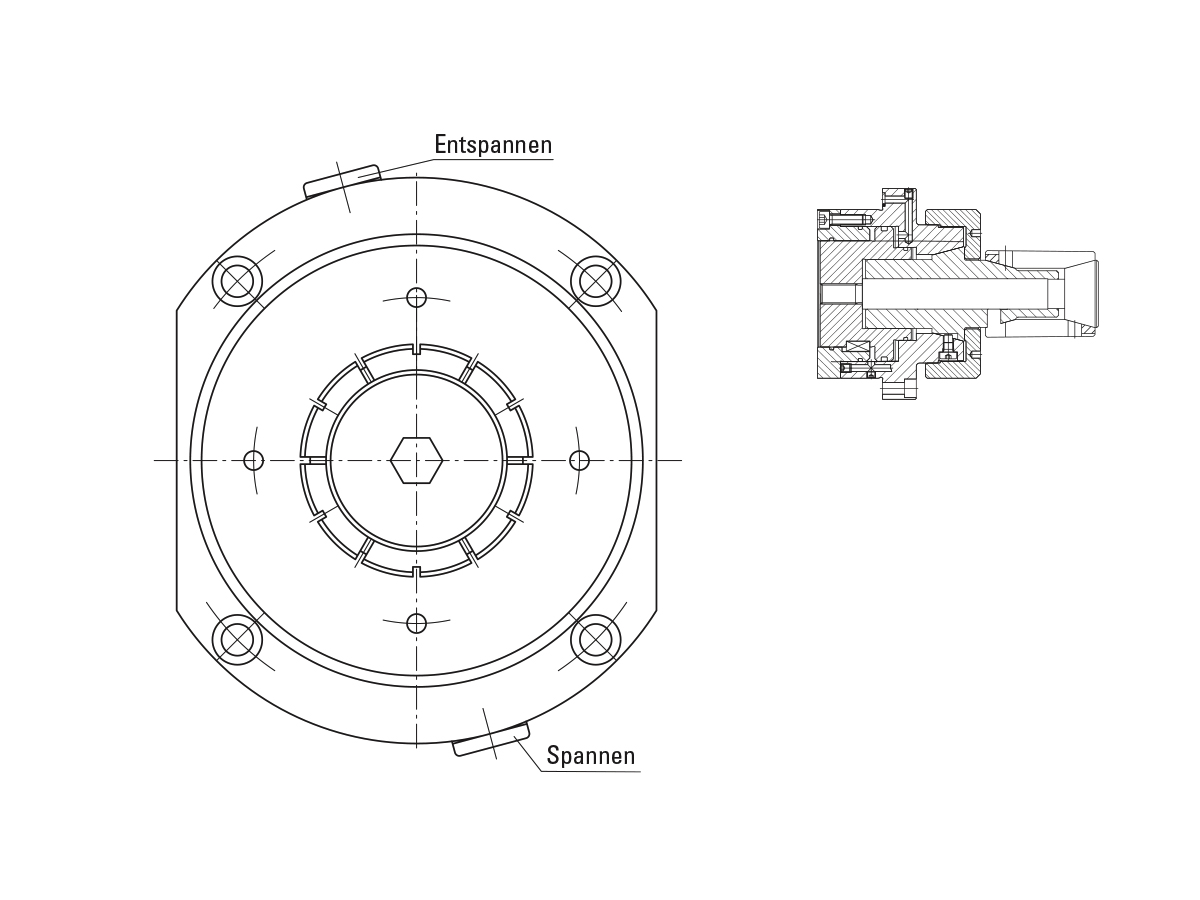 Bei den Standardgeräten ist die Druckhülse als doppelt wirkender Zylinder ausgeführt und schließt bzw. öffnet die Spannzangen. Die Spannzangen selbst sind am Schaft mit einer Planschulter versehen und mittels einer Mutter fest mit dem Einbauspanner verbunden. Diese Spanngeräte eignen sich auch hervorragend zum Innenspannen von Werkstücken. Dazu wird statt der eingebauten Spannzange ein axial feststehender Grunddorn mit der Außenkontur einer Spannzange eingebaut und mit einer Überwurfmutter in das Gehäuse eingeschraubt. Zum Spannen des Werkstückes wird, je nach Anwendungsfall, eine einfach- oder doppelkegelige Spannhülse verwendet. Diese wird beim Spannen mittels Zugdorn auf den Grunddorn gezogen und aufgeweitet. Hierbei entsteht ein Niederzugeffekt, das Werkstück wird beim Spannen in Richtung des Gehäuses gezogen; gerne legen wir diese Futter für einen Werkstückanschlag aus. Selbstverständlich werden diese Geräte, falls erforderlich, speziell für Ihre Anwendungen anders ausgelegt.