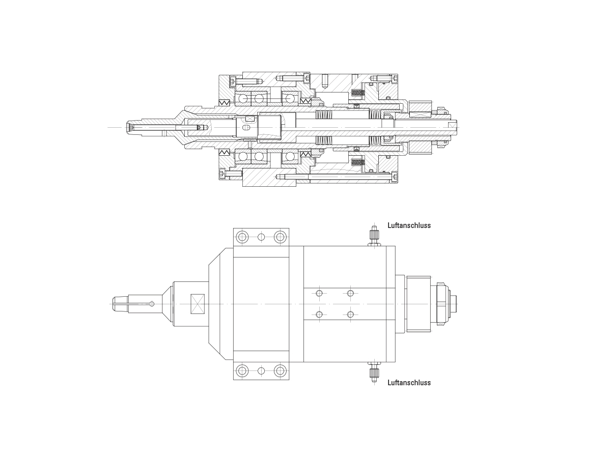 Spindeleinheiten für Druckspannzangen pneumatische Betätigung, doppelt wirkender Kolben