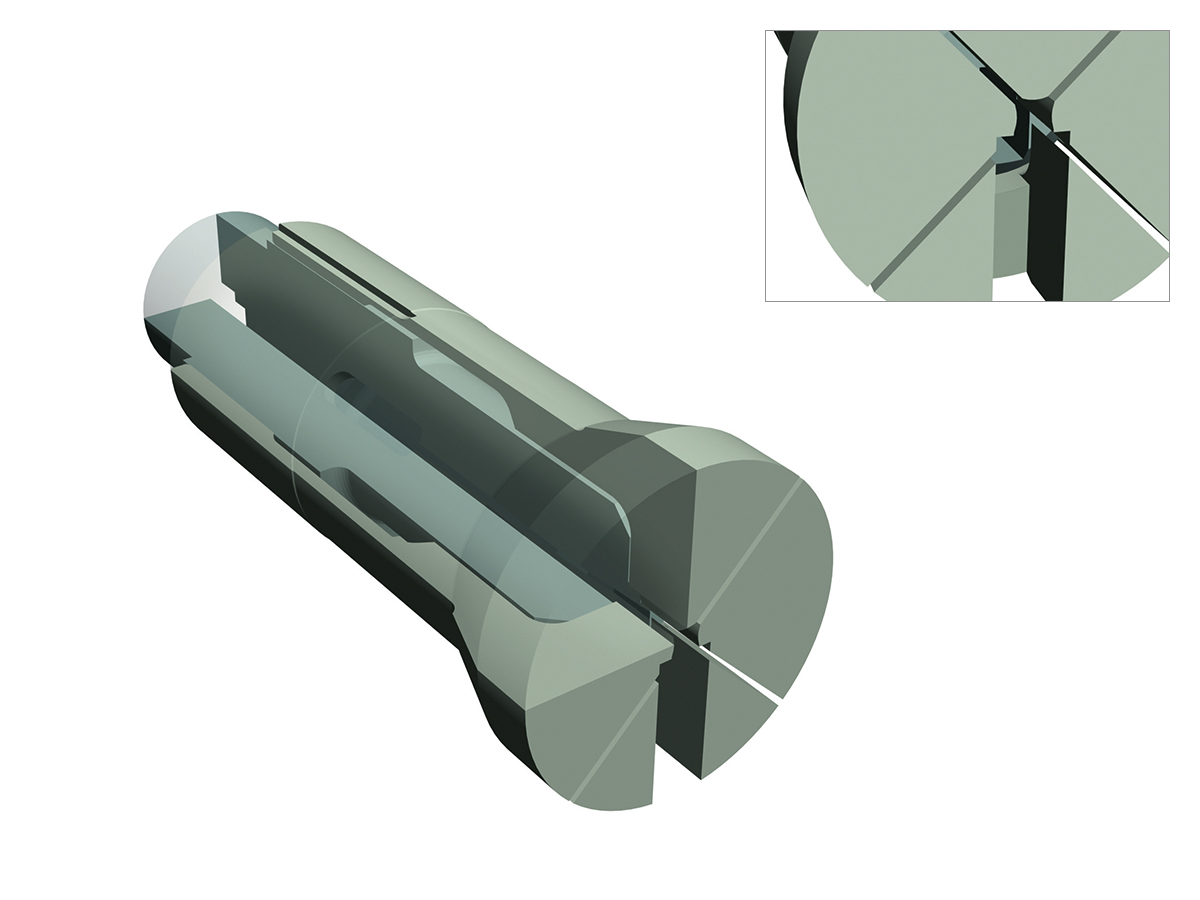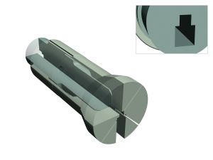 Für bestimmte Anwendungsfälle können wir eine Spannzange mit einer Werkstückzuführung versehen. Wie beim Einbau eines Anschlages wird die Freibohrung der Spannzange ausgeschliffen und die Werkstückzuführung in die geschliffene Freibohrung eingepasst. Das Werkstück wird durch die eingebaute Führung von hinten in die Spannzange zugeführt.